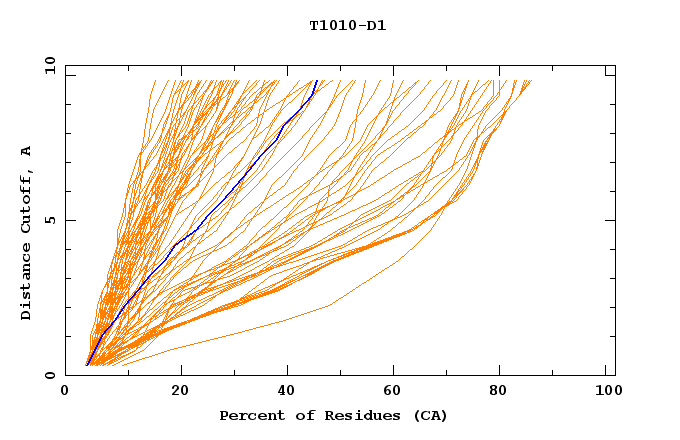 GDT analysis: largest set of CA atoms (percent of the modeled structure) that can fit under DISTANCE cutoff: 0.5A, 1.0A, 1.5A, ... , 10.0A