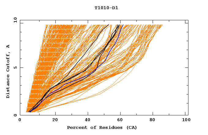 GDT analysis: largest set of CA atoms (percent of the modeled structure) that can fit under DISTANCE cutoff: 0.5A, 1.0A, 1.5A, ... , 10.0A