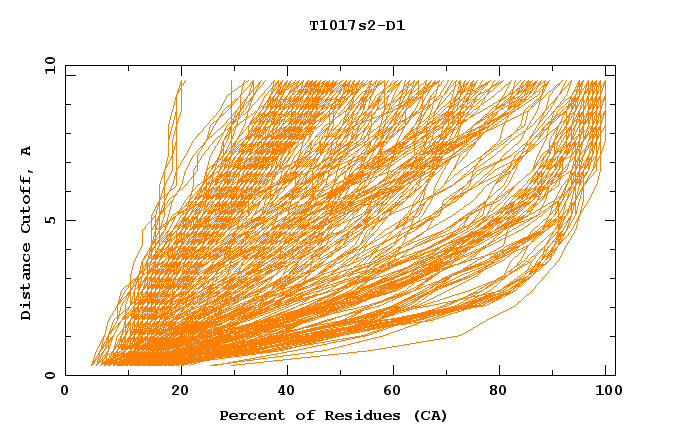 GDT analysis: largest set of CA atoms (percent of the modeled structure) that can fit under DISTANCE cutoff: 0.5A, 1.0A, 1.5A, ... , 10.0A