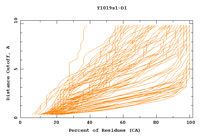 GDT analysis: largest set of CA atoms (percent of the modeled structure) that can fit under DISTANCE cutoff: 0.5A, 1.0A, 1.5A, ... , 10.0A