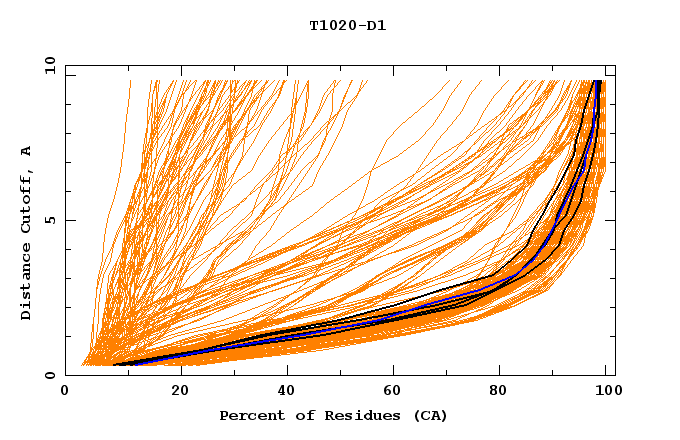 GDT analysis: largest set of CA atoms (percent of the modeled structure) that can fit under DISTANCE cutoff: 0.5A, 1.0A, 1.5A, ... , 10.0A