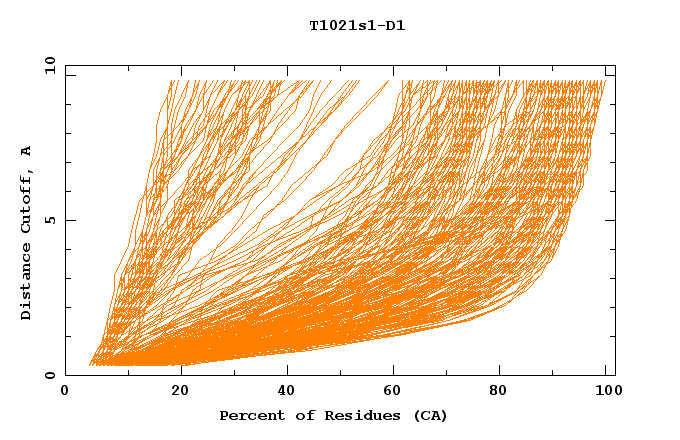 GDT analysis: largest set of CA atoms (percent of the modeled structure) that can fit under DISTANCE cutoff: 0.5A, 1.0A, 1.5A, ... , 10.0A