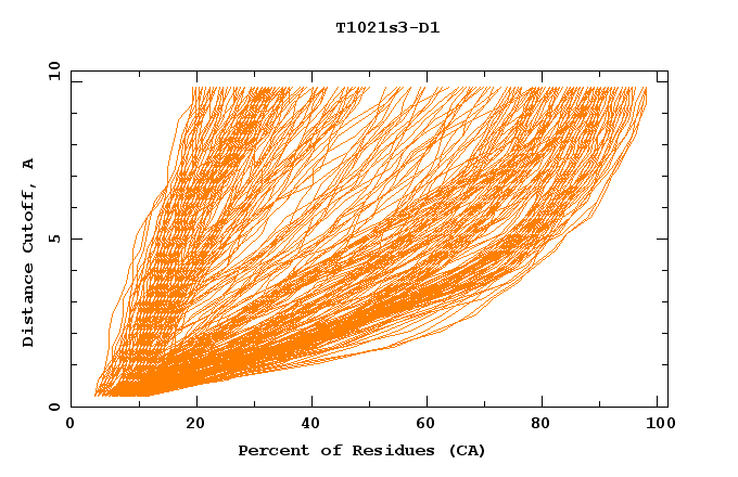 GDT analysis: largest set of CA atoms (percent of the modeled structure) that can fit under DISTANCE cutoff: 0.5A, 1.0A, 1.5A, ... , 10.0A