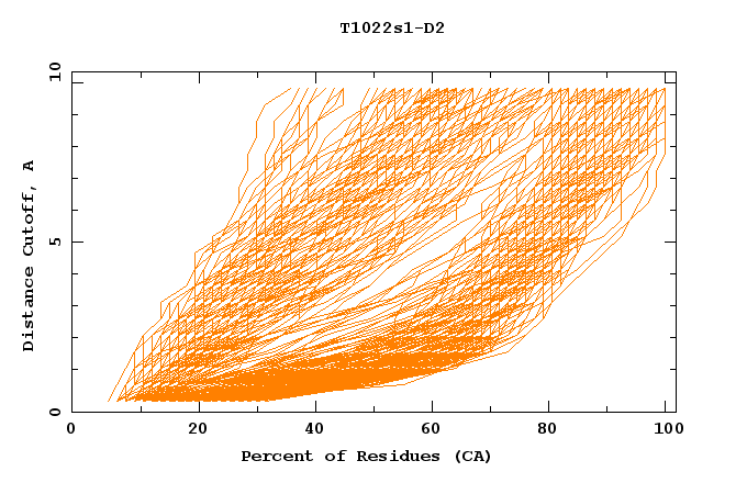 GDT analysis: largest set of CA atoms (percent of the modeled structure) that can fit under DISTANCE cutoff: 0.5A, 1.0A, 1.5A, ... , 10.0A