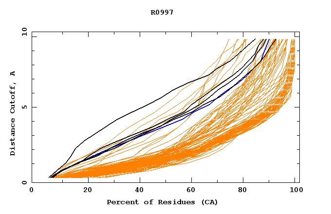 GDT analysis: largest set of CA atoms (percent of the modeled structure) that can fit under DISTANCE cutoff: 0.5A, 1.0A, 1.5A, ... , 10.0A