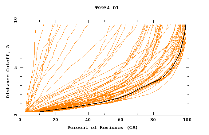 GDT analysis: largest set of CA atoms (percent of the modeled structure) that can fit under DISTANCE cutoff: 0.5A, 1.0A, 1.5A, ... , 10.0A