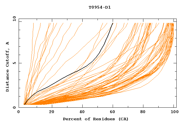 GDT analysis: largest set of CA atoms (percent of the modeled structure) that can fit under DISTANCE cutoff: 0.5A, 1.0A, 1.5A, ... , 10.0A