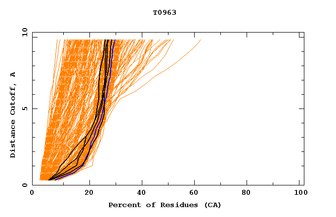 GDT analysis: largest set of CA atoms (percent of the modeled structure) that can fit under DISTANCE cutoff: 0.5A, 1.0A, 1.5A, ... , 10.0A