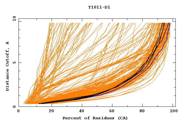 GDT analysis: largest set of CA atoms (percent of the modeled structure) that can fit under DISTANCE cutoff: 0.5A, 1.0A, 1.5A, ... , 10.0A