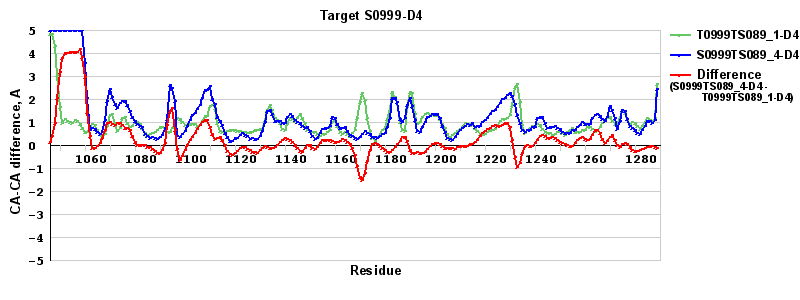 | Red line = (blue line) - (green thick line): difference between the corresponding "Assisted Model"-Target and "Regular Model"-Target CA-CA distances (see above). Negative values show regions where the "assisted" model has better fit to the target than the reference model, i.e. areas of potential improvement. |
