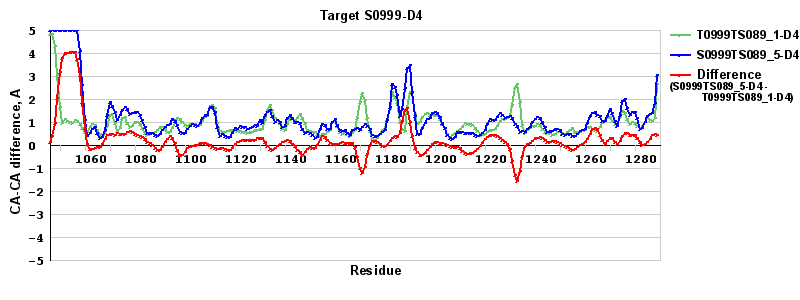 | Red line = (blue line) - (green thick line): difference between the corresponding "Assisted Model"-Target and "Regular Model"-Target CA-CA distances (see above). Negative values show regions where the "assisted" model has better fit to the target than the reference model, i.e. areas of potential improvement. |