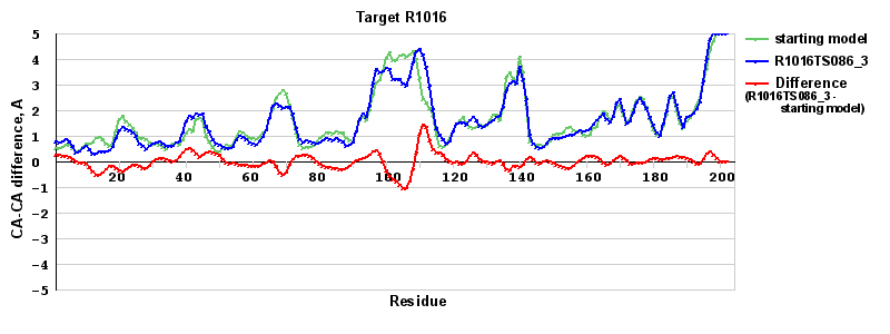 | Red line = (blue line) - (green thick line): difference between the corresponding Refined Model-Target and Starting Model-Target CA-CA distances (see above). Negative values show regions where the reifned model has better fit to the target than the starting model, i.e. areas of potential improvement. |