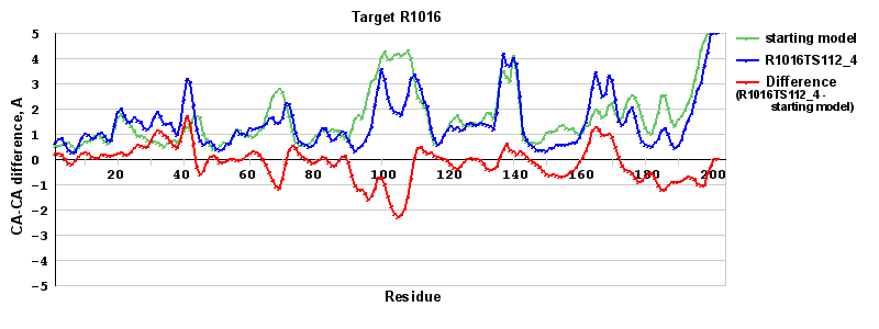 | Red line = (blue line) - (green thick line): difference between the corresponding Refined Model-Target and Starting Model-Target CA-CA distances (see above). Negative values show regions where the reifned model has better fit to the target than the starting model, i.e. areas of potential improvement. |