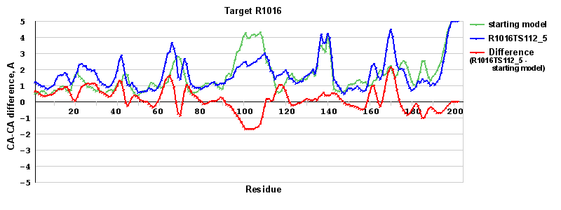 | Red line = (blue line) - (green thick line): difference between the corresponding Refined Model-Target and Starting Model-Target CA-CA distances (see above). Negative values show regions where the reifned model has better fit to the target than the starting model, i.e. areas of potential improvement. |