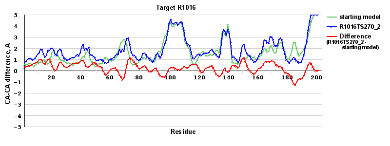 | Red line = (blue line) - (green thick line): difference between the corresponding Refined Model-Target and Starting Model-Target CA-CA distances (see above). Negative values show regions where the reifned model has better fit to the target than the starting model, i.e. areas of potential improvement. |