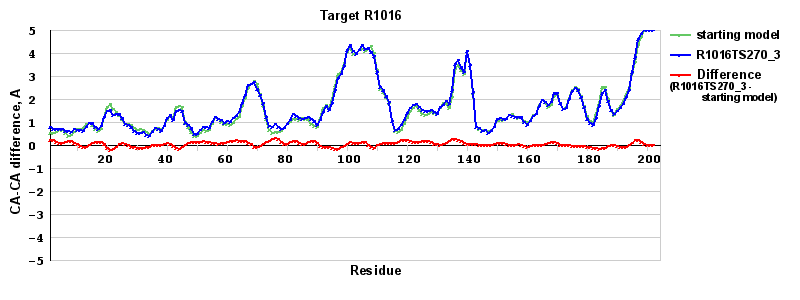 | Red line = (blue line) - (green thick line): difference between the corresponding Refined Model-Target and Starting Model-Target CA-CA distances (see above). Negative values show regions where the reifned model has better fit to the target than the starting model, i.e. areas of potential improvement. |
