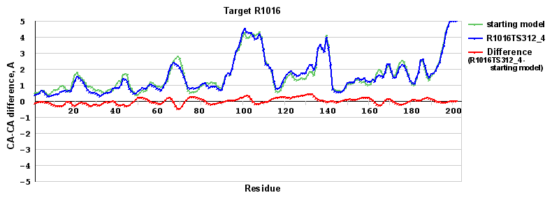 | Red line = (blue line) - (green thick line): difference between the corresponding Refined Model-Target and Starting Model-Target CA-CA distances (see above). Negative values show regions where the reifned model has better fit to the target than the starting model, i.e. areas of potential improvement. |