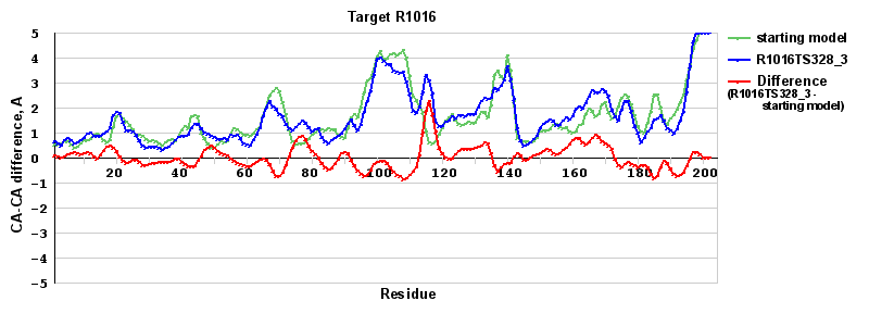| Red line = (blue line) - (green thick line): difference between the corresponding Refined Model-Target and Starting Model-Target CA-CA distances (see above). Negative values show regions where the reifned model has better fit to the target than the starting model, i.e. areas of potential improvement. |