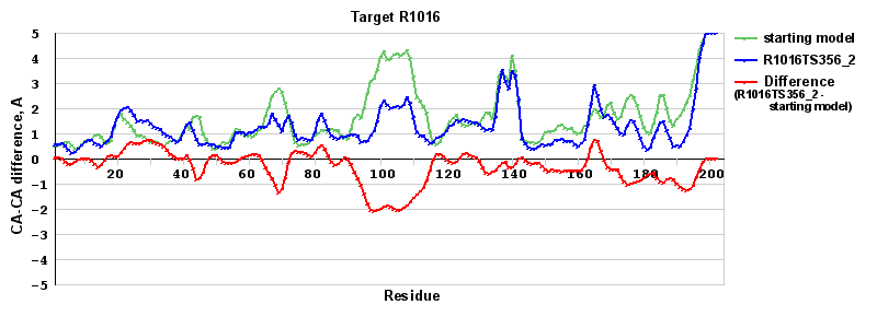 | Red line = (blue line) - (green thick line): difference between the corresponding Refined Model-Target and Starting Model-Target CA-CA distances (see above). Negative values show regions where the reifned model has better fit to the target than the starting model, i.e. areas of potential improvement. |