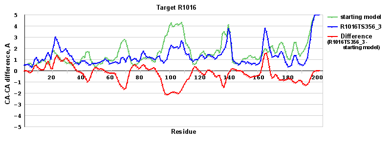 | Red line = (blue line) - (green thick line): difference between the corresponding Refined Model-Target and Starting Model-Target CA-CA distances (see above). Negative values show regions where the reifned model has better fit to the target than the starting model, i.e. areas of potential improvement. |