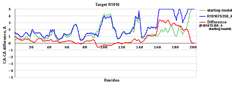 | Red line = (blue line) - (green thick line): difference between the corresponding Refined Model-Target and Starting Model-Target CA-CA distances (see above). Negative values show regions where the reifned model has better fit to the target than the starting model, i.e. areas of potential improvement. |