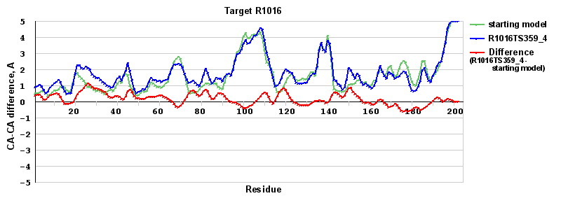 | Red line = (blue line) - (green thick line): difference between the corresponding Refined Model-Target and Starting Model-Target CA-CA distances (see above). Negative values show regions where the reifned model has better fit to the target than the starting model, i.e. areas of potential improvement. |