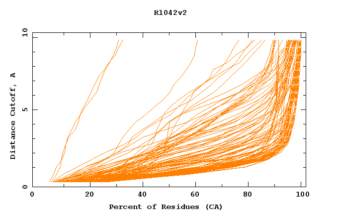 GDT analysis: largest set of CA atoms (percent of the modeled structure) that can fit under DISTANCE cutoff: 0.5A, 1.0A, 1.5A, ... , 10.0A