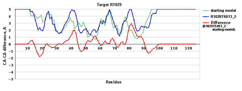 | Red line = (blue line) - (green thick line): difference between the corresponding Refined Model-Target and Starting Model-Target CA-CA distances (see above). Negative values show regions where the reifned model has better fit to the target than the starting model, i.e. areas of potential improvement. |