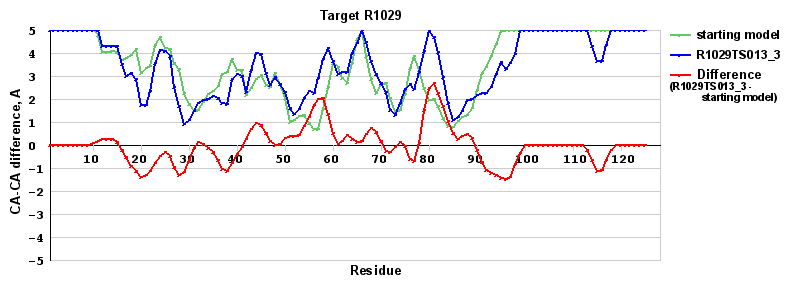 | Red line = (blue line) - (green thick line): difference between the corresponding Refined Model-Target and Starting Model-Target CA-CA distances (see above). Negative values show regions where the reifned model has better fit to the target than the starting model, i.e. areas of potential improvement. |
