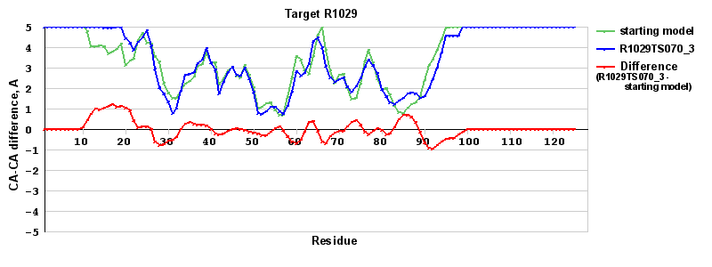 | Red line = (blue line) - (green thick line): difference between the corresponding Refined Model-Target and Starting Model-Target CA-CA distances (see above). Negative values show regions where the reifned model has better fit to the target than the starting model, i.e. areas of potential improvement. |