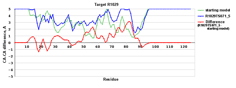 | Red line = (blue line) - (green thick line): difference between the corresponding Refined Model-Target and Starting Model-Target CA-CA distances (see above). Negative values show regions where the reifned model has better fit to the target than the starting model, i.e. areas of potential improvement. |