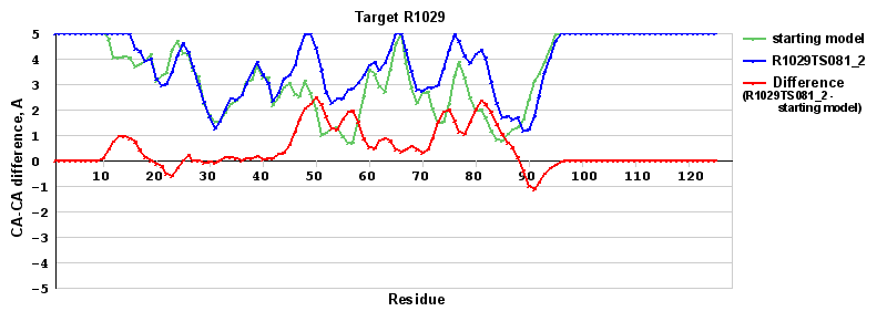 | Red line = (blue line) - (green thick line): difference between the corresponding Refined Model-Target and Starting Model-Target CA-CA distances (see above). Negative values show regions where the reifned model has better fit to the target than the starting model, i.e. areas of potential improvement. |