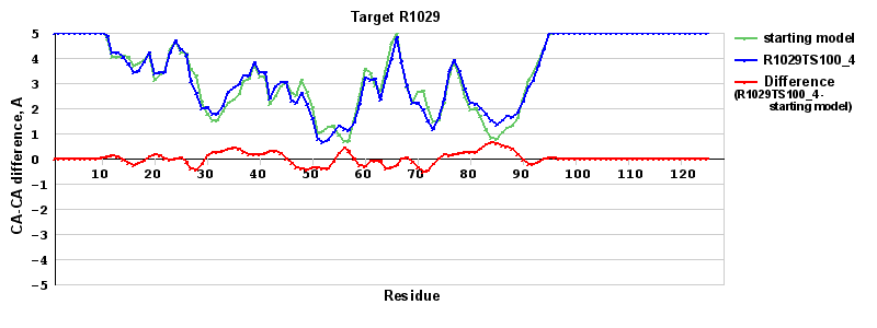 | Red line = (blue line) - (green thick line): difference between the corresponding Refined Model-Target and Starting Model-Target CA-CA distances (see above). Negative values show regions where the reifned model has better fit to the target than the starting model, i.e. areas of potential improvement. |
