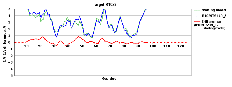 | Red line = (blue line) - (green thick line): difference between the corresponding Refined Model-Target and Starting Model-Target CA-CA distances (see above). Negative values show regions where the reifned model has better fit to the target than the starting model, i.e. areas of potential improvement. |