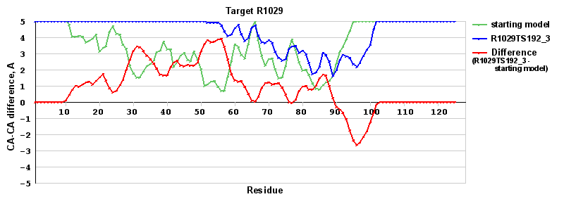 | Red line = (blue line) - (green thick line): difference between the corresponding Refined Model-Target and Starting Model-Target CA-CA distances (see above). Negative values show regions where the reifned model has better fit to the target than the starting model, i.e. areas of potential improvement. |