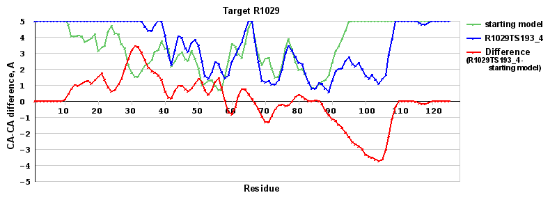 | Red line = (blue line) - (green thick line): difference between the corresponding Refined Model-Target and Starting Model-Target CA-CA distances (see above). Negative values show regions where the reifned model has better fit to the target than the starting model, i.e. areas of potential improvement. |