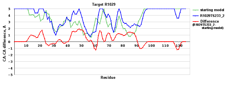 | Red line = (blue line) - (green thick line): difference between the corresponding Refined Model-Target and Starting Model-Target CA-CA distances (see above). Negative values show regions where the reifned model has better fit to the target than the starting model, i.e. areas of potential improvement. |