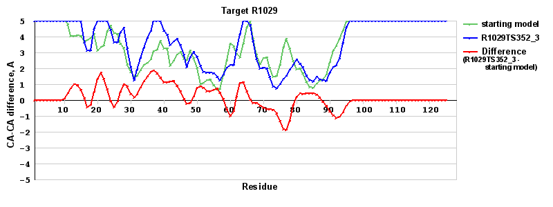 | Red line = (blue line) - (green thick line): difference between the corresponding Refined Model-Target and Starting Model-Target CA-CA distances (see above). Negative values show regions where the reifned model has better fit to the target than the starting model, i.e. areas of potential improvement. |