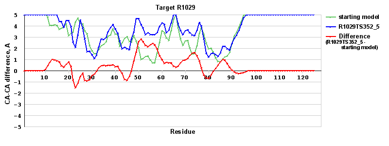 | Red line = (blue line) - (green thick line): difference between the corresponding Refined Model-Target and Starting Model-Target CA-CA distances (see above). Negative values show regions where the reifned model has better fit to the target than the starting model, i.e. areas of potential improvement. |