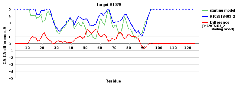 | Red line = (blue line) - (green thick line): difference between the corresponding Refined Model-Target and Starting Model-Target CA-CA distances (see above). Negative values show regions where the reifned model has better fit to the target than the starting model, i.e. areas of potential improvement. |