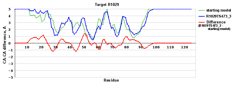 | Red line = (blue line) - (green thick line): difference between the corresponding Refined Model-Target and Starting Model-Target CA-CA distances (see above). Negative values show regions where the reifned model has better fit to the target than the starting model, i.e. areas of potential improvement. |
