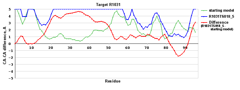 | Red line = (blue line) - (green thick line): difference between the corresponding Refined Model-Target and Starting Model-Target CA-CA distances (see above). Negative values show regions where the reifned model has better fit to the target than the starting model, i.e. areas of potential improvement. |