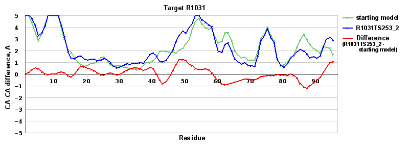 | Red line = (blue line) - (green thick line): difference between the corresponding Refined Model-Target and Starting Model-Target CA-CA distances (see above). Negative values show regions where the reifned model has better fit to the target than the starting model, i.e. areas of potential improvement. |