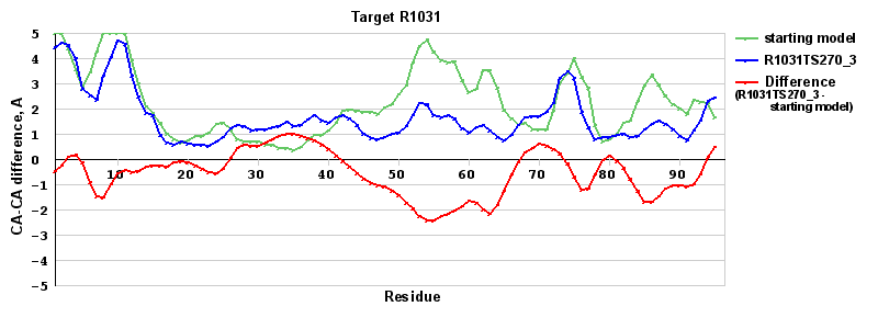 | Red line = (blue line) - (green thick line): difference between the corresponding Refined Model-Target and Starting Model-Target CA-CA distances (see above). Negative values show regions where the reifned model has better fit to the target than the starting model, i.e. areas of potential improvement. |