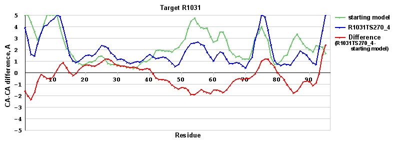 | Red line = (blue line) - (green thick line): difference between the corresponding Refined Model-Target and Starting Model-Target CA-CA distances (see above). Negative values show regions where the reifned model has better fit to the target than the starting model, i.e. areas of potential improvement. |