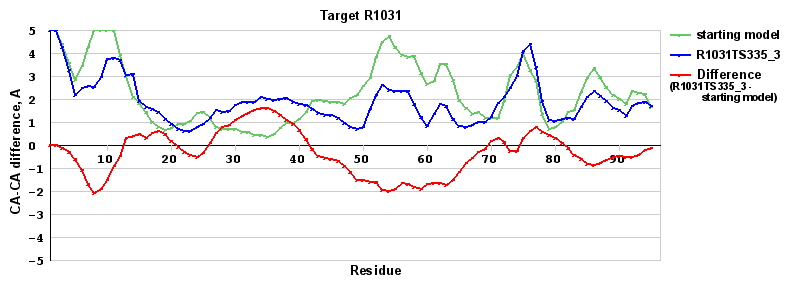 | Red line = (blue line) - (green thick line): difference between the corresponding Refined Model-Target and Starting Model-Target CA-CA distances (see above). Negative values show regions where the reifned model has better fit to the target than the starting model, i.e. areas of potential improvement. |