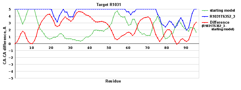 | Red line = (blue line) - (green thick line): difference between the corresponding Refined Model-Target and Starting Model-Target CA-CA distances (see above). Negative values show regions where the reifned model has better fit to the target than the starting model, i.e. areas of potential improvement. |