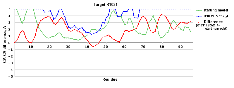 | Red line = (blue line) - (green thick line): difference between the corresponding Refined Model-Target and Starting Model-Target CA-CA distances (see above). Negative values show regions where the reifned model has better fit to the target than the starting model, i.e. areas of potential improvement. |