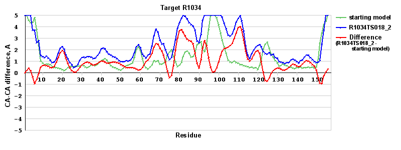 | Red line = (blue line) - (green thick line): difference between the corresponding Refined Model-Target and Starting Model-Target CA-CA distances (see above). Negative values show regions where the reifned model has better fit to the target than the starting model, i.e. areas of potential improvement. |