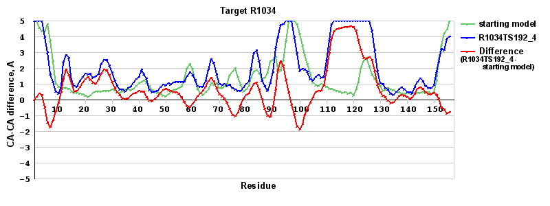 | Red line = (blue line) - (green thick line): difference between the corresponding Refined Model-Target and Starting Model-Target CA-CA distances (see above). Negative values show regions where the reifned model has better fit to the target than the starting model, i.e. areas of potential improvement. |